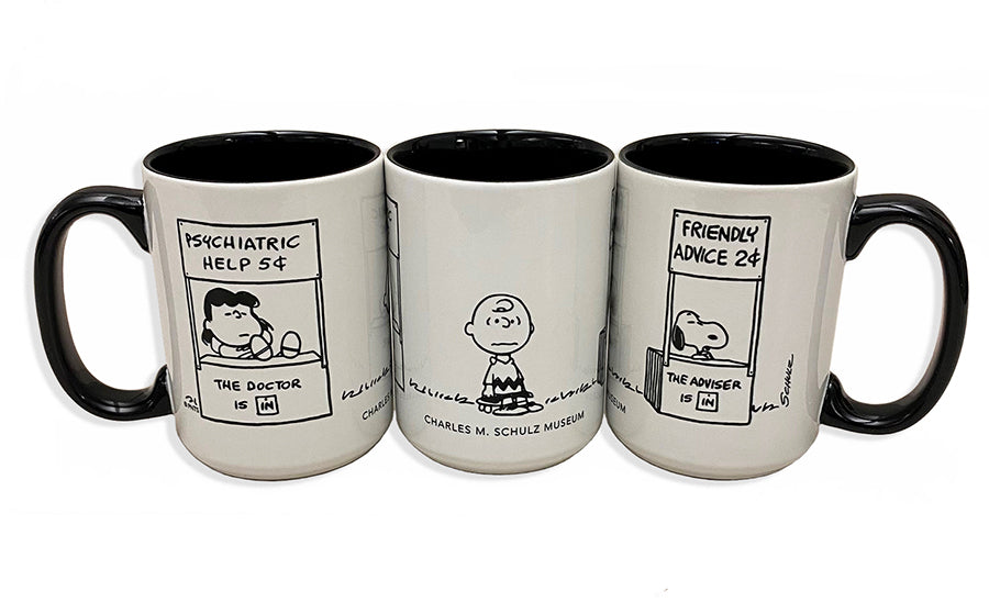 Sturdy stoneware mug has a 15 ounce capacity and is top-rack residential dishwasher & microwave safe. Complies with FDA, Prop 65. (The photo shows all 3 views of the same mug.) Sold exclusively at the Schulz Museum.